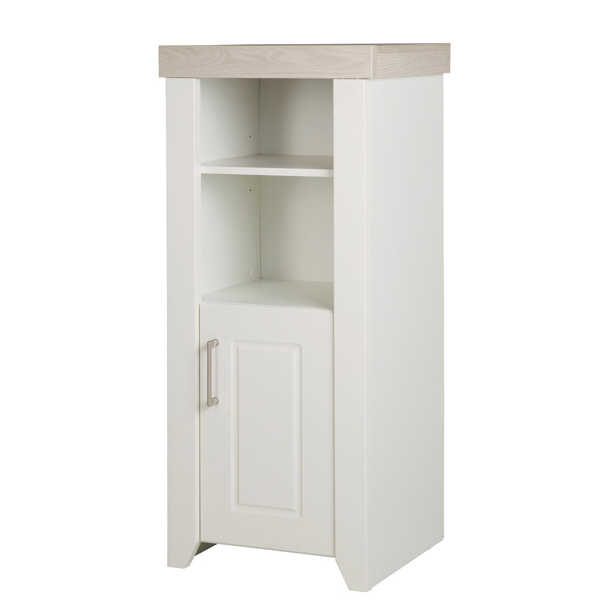 Das roba Standregal 'Felicia' bietet hinter seiner Tür mit hochwertigem Metallgriff und den zwei offenen Regalfächern Stauraum für Kinderspielzeug und Kinderkleidung und sorgt so für Ordnung im Kinder- oder Babyzimmer. Hinter der Tür im unteren Bereich des Standregals finden zum Beispiel Söckchen, Unterwäsche, oder Bücher ihren Platz. Die eingebaute Soft-Close-Technik ermöglicht ein sanftes, leises Schließen der Tür. Das schlanke Regal verfügt als besonderes Design-Highlight moderne Stollen mit konischem Fuß. Das praktische Standregal lässt sich mit weiteren Baby- und Kindermöbeln aus der Serie 'Felicia' perfekt zu einem komplett eingerichteten Baby- oder Kinderzimmer mit mitwachsenden Systemmöbeln erweitern. Das roba Standregal mit Kranz Dekor 'Luna Elm' leistet Ihnen viele Jahre gute Dienste, denn es macht auch alleine stehend als Einzelmöbel eine gute Figur. Wenn Ihr Kind größer ist kann es auch als Bücher- oder Dekoregal im Wohn- oder Jugendzimmer zum Einsatz kommen. Das Regal ist in Deutschland entwickelt, wurde in der EU produziert und ist montagefreundlich. (H x B x T): 115 x 49 cm x 42 cm.